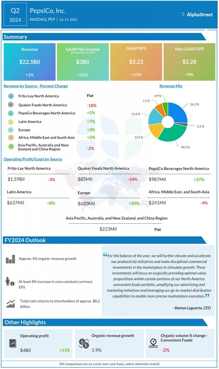 PepsiCo, Inc. (NASDAQ: PEP) reported its second quarter 2024 earnings results today. Net revenue rose 1% year-over-year to...