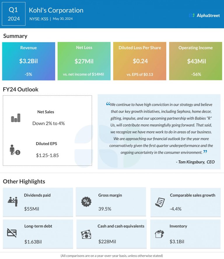Kohl’s Corporation (NYSE: KSS) reported first quarter 2024 earnings results today. Net sales decreased 5.3% year-over-year to $3.2...