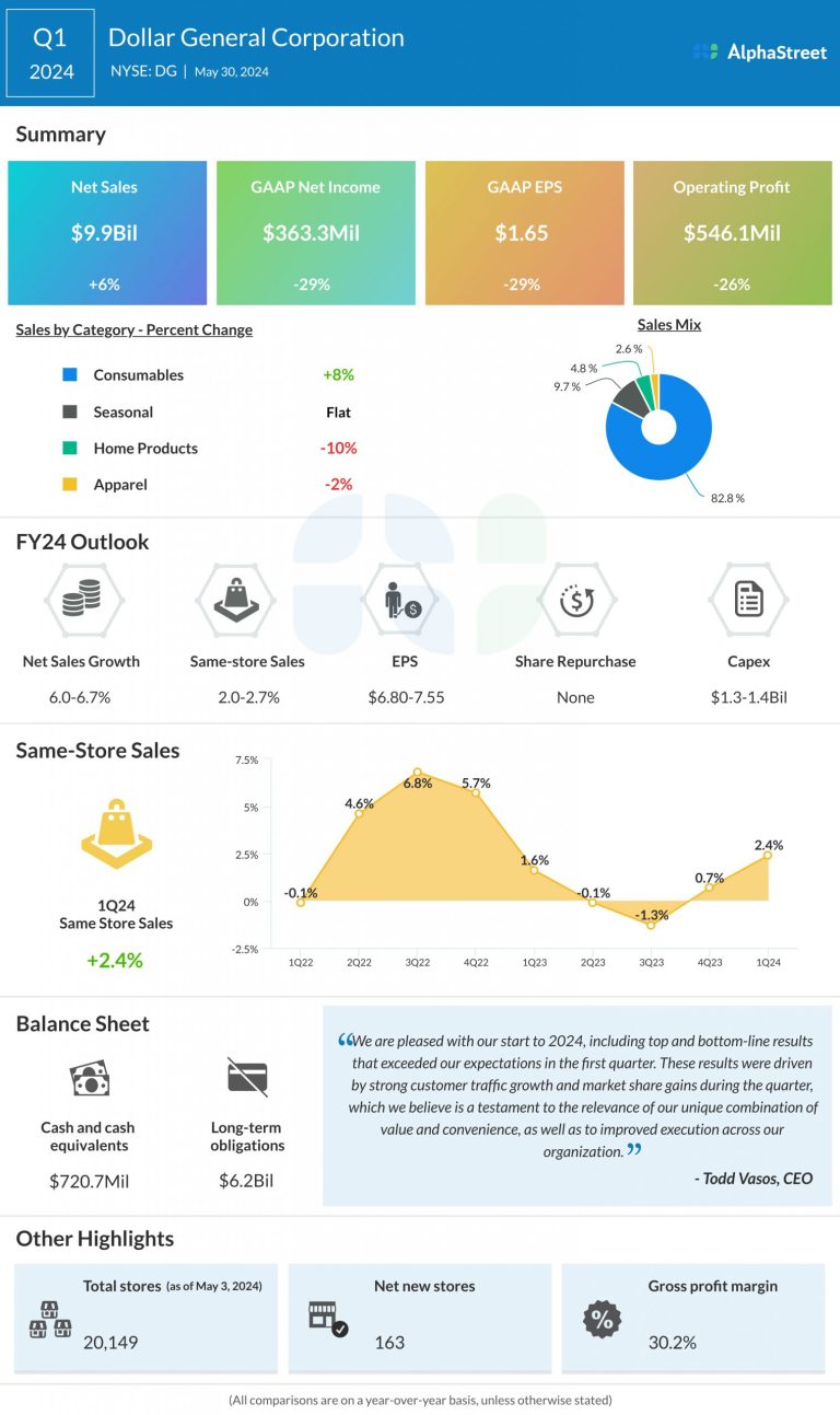 Dollar General Corporation (NYSE: DG) reported its first quarter 2024 earnings results today. Net sales increased 6.1% year-over-year to...