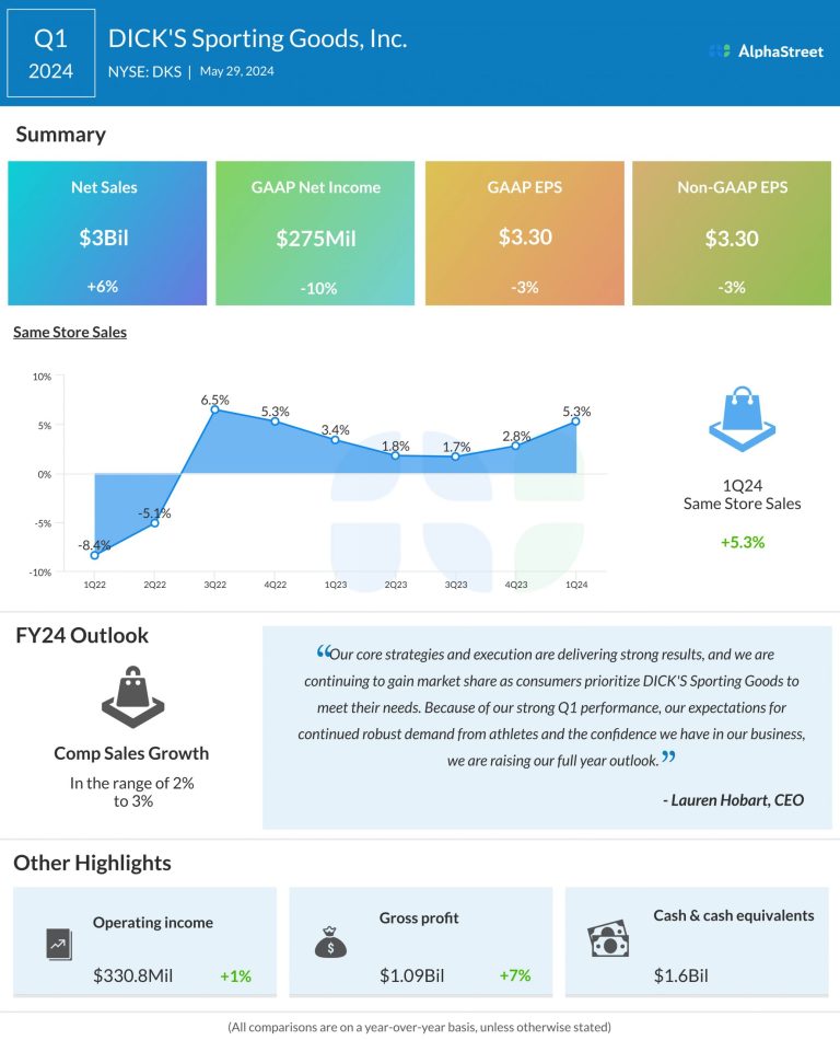 DICK’S Sporting Goods, Inc. (NYSE: DKS) reported its first quarter 2024 earnings results today. Net sales increased 6.2% year-over-year...