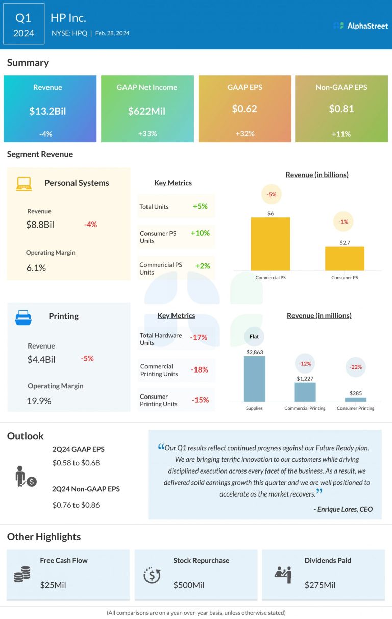 HP Inc. (NYSE: HPQ) reported first quarter 2024 earnings results today. Net revenue of $13.2 billion was down...