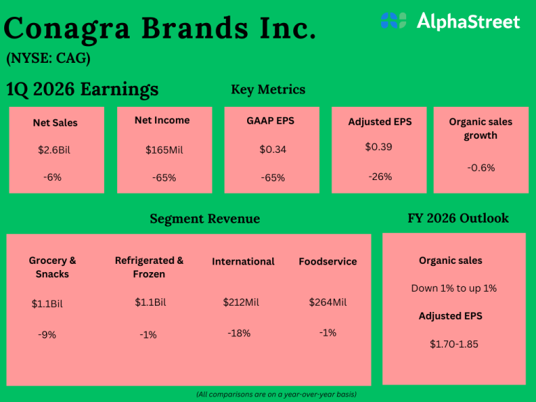 Shares of Conagra Brands, Inc. (NYSE: CAG) rose 1% on Friday. The stock has dropped 7% in the...