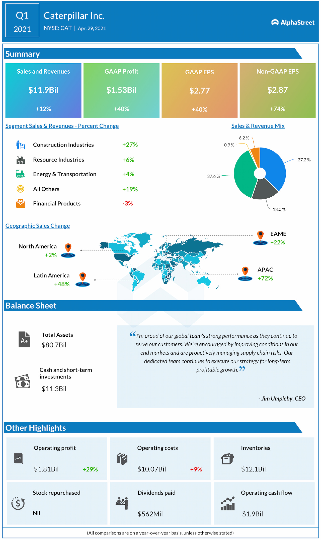 Caterpillar Inc. (NYSE: CAT) reported first-quarter 2021 earnings results today.