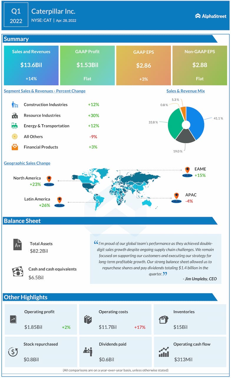 Caterpillar Inc. (NYSE: CAT) reported sales and revenues of $13.6 billion for the first quarter of 2022, up 14% from the same period a year ago, driven by higher sales volume which in turn was fueled by higher end-user demand for equipment and services.