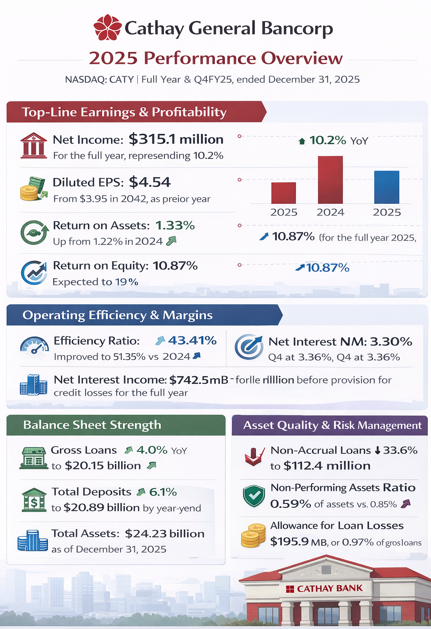 Cathay General Bancorp (Nasdaq: CATY), a bank holding company that operates through its principal subsidiary, Cathay Bank, providing a wide range of financial services primarily to the Chinese-American and Asian-American markets, announced its financial results for the fourth quarter and full year of 2025, highlighting significant year-over-year growth in net income and a strengthened net interest margin.