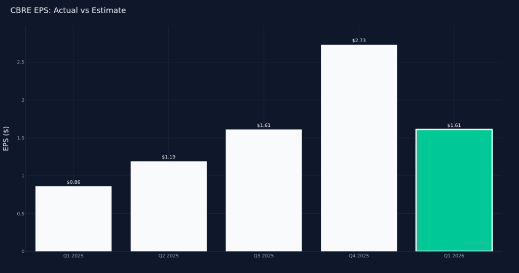 CBRE Group, Inc. (CBRE) reported Q1 2026 Core earnings of $1.61 per share, beating the $1.15 consensus estimate (beat by 40.0%).