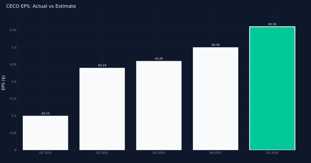 CECO|EPS $0.36 vs $0.15 est (+140.0%)|Rev $205.9M|Net Loss $398,000Strong beat. CECO Environmental Corp. (NASDAQ:CECO) delivered Q1 2026 non-GAAP earnings of $0.36 per share, crushing the $0.15 consensus estimate by 140.0% in a quarter that showcased accelerating momentum across the pollution and treatment controls specialist’s end markets. Revenue reached $205.9M, up 17.0% from $176.7M in the year-ago period, while bottom-line profit came in at $13.9M. Shares traded largely unchanged following the release, suggesting investors may be pausing to assess the sustainability of this outperformance.