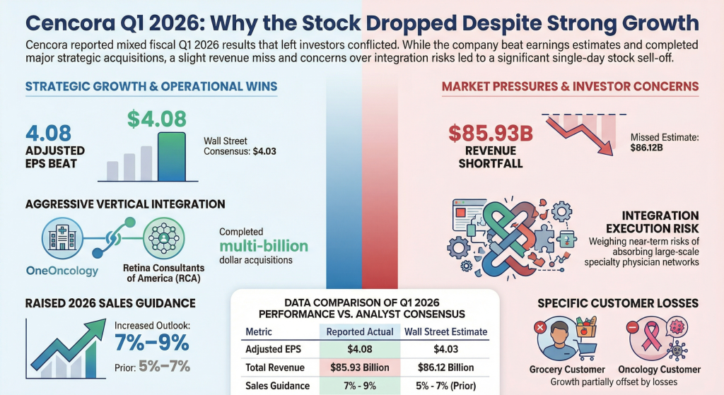 Shares of Cencora, Inc. (NYSE: COR) fell 8.8% to close at $329.85 on Wednesday, as investors weighed a marginal revenue miss and a sharp decline in international operating income against an improved full-year operating outlook. The stock gapped down at the open despite an adjusted earnings beat, marking its steepest one-day decline in over a year.
