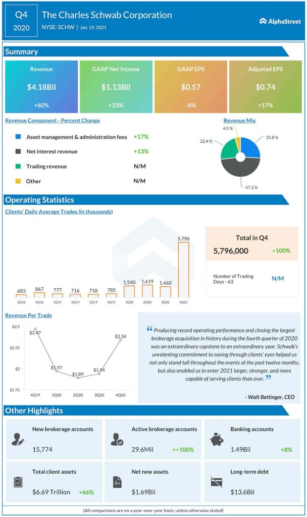 CEO Walt Bettinger said, “The pandemic’s rapid escalation in early 2020 was accompanied by volatile equity markets and further easing of monetary policy. As the year progressed, government aid packages and vaccine developments helped settle the markets”.
