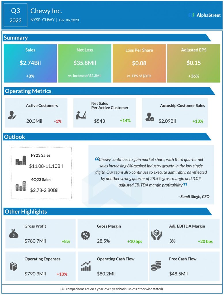 Chewy, Inc. (NYSE: CHWY) reported net sales of $2.74 billion for the third quarter of 2023, which was up 8.2% year-over-year.