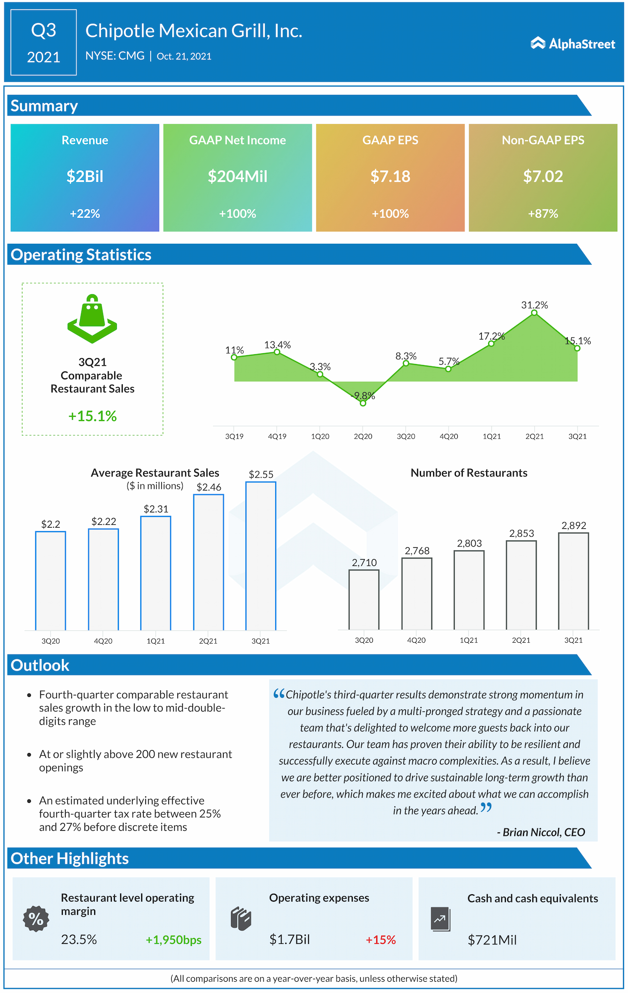 Chipotle Mexican Grill (NYSE: CMG) reported third-quarter 2021 earnings results today.
