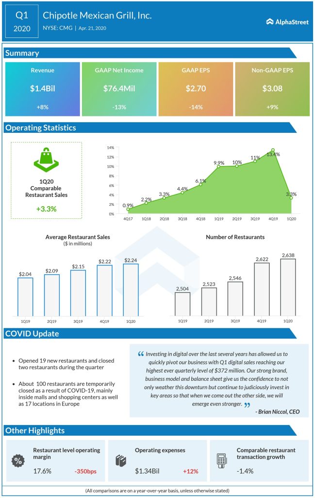 Chipotle said it has recovered from the safety incidents lined up from 2015-2018, paying a record fine of $25 million to resolve criminal charges. Acknowledging that the consumer sentiment would trend towards safety concerns, it has installed supplied sanitizer for employees and mandated guidelines for safety. Separately, the chain has engaged a third-party consultant for inspection of restaurants and employed and independent Food Safety Advisory Council.