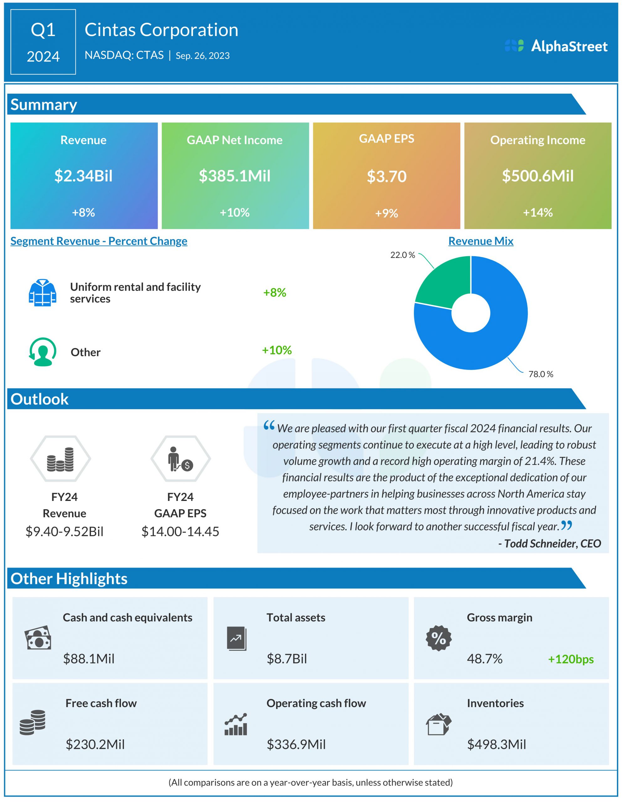 Cintas Corporation (NASDAQ: CTAS) reported first quarter 2024 earnings results today.