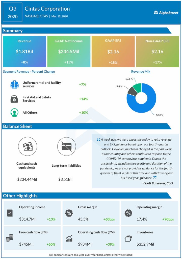 — The Uniform Rental and Facility Services segment registered a 4.8% organic sales growth, while First Aid and Safety Services recorded a 12.5% gain.
