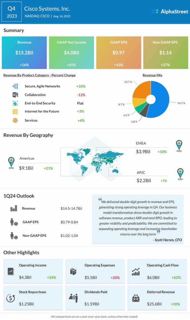 The San Jose-headquartered network gear maker said that earnings, excluding special items, rose to $1.14 per share in the July quarter from $0.83 per share in the same period of 2022. Unadjusted net income was $4.0 billion or $0.97 per share, compared to last year’s profit of $2.8 billion or $0.68 per share.