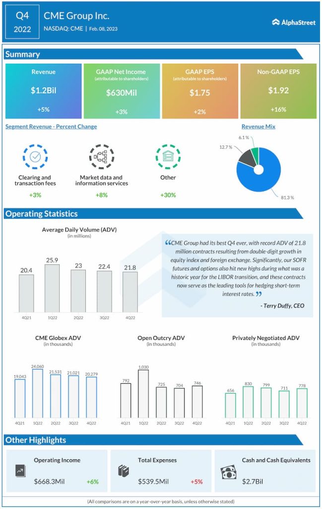 CME Group Inc. (NASDAQ: CME) reported revenue of $1.2 billion for the fourth quarter of 2022, up 5% year-over-year.