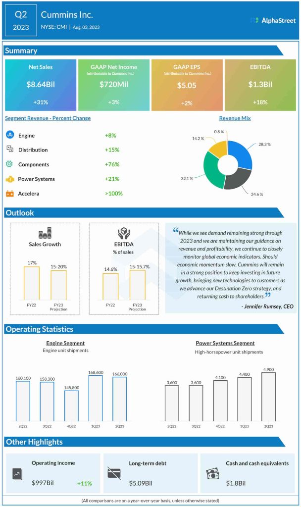 Cummins Inc. (NYSE: CMI), a leading provider of power solutions, reported higher net sales and earnings for the second quarter of 2023. The management reaffirmed its full-year guidance.