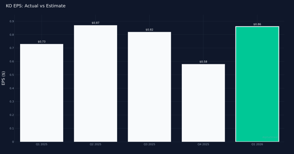 Solid Beat. The Coca-Cola Company (NYSE:KO) delivered Q1 2026 comparable EPS of $0.86, topping Wall Street's $0.84 estimate by 2.4%, while revenue climbed t...