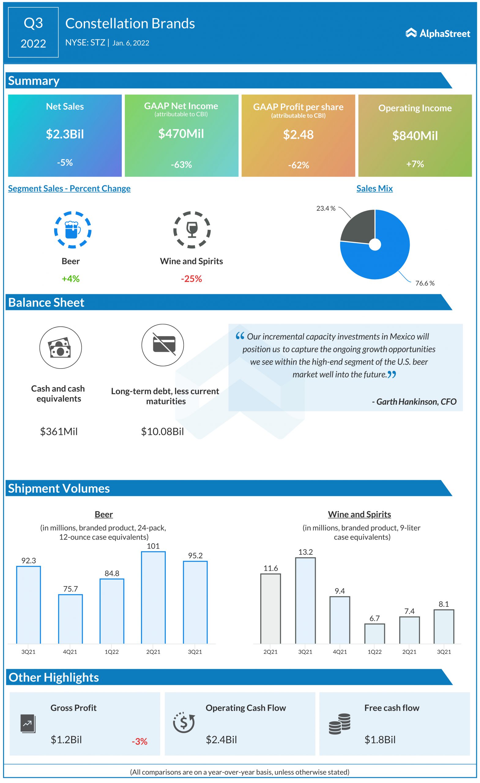 Constellation Brands (NYSE: STZ), the largest beer producer in the U.S, reported third-quarter 2022 earnings results today.