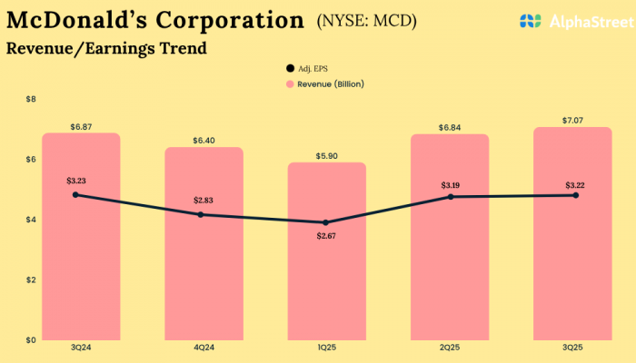 McDonald's Corporation (NYSE: MCD) reported its third quarter 2025 earnings results today. Revenues increased 3% year-over-year to $7 billion. Global comparable sales