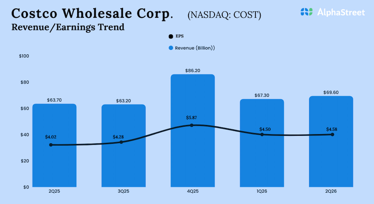 Warehouse giant Costco Wholesale Corporation (NASDAQ: COST) on Thursday reported higher sales and net income for the second quarter of fiscal 2026. Earnings topped expectations.