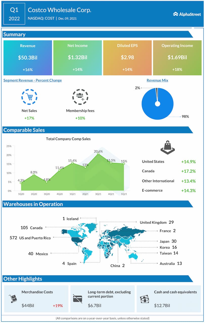 Costco Wholesale Corporation (NASDAQ: COST) reported total revenue of $50.3 billion for the first quarter of 2022, up 16% year-over-year.