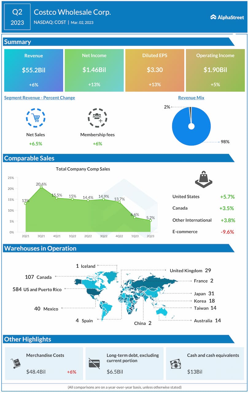 Costco Wholesale Corporation (NASDAQ: COST) reported total revenue of $55.2 billion for the second quarter of 2023, up 6% from the same period last year. Comparable sales were up 5.2%.