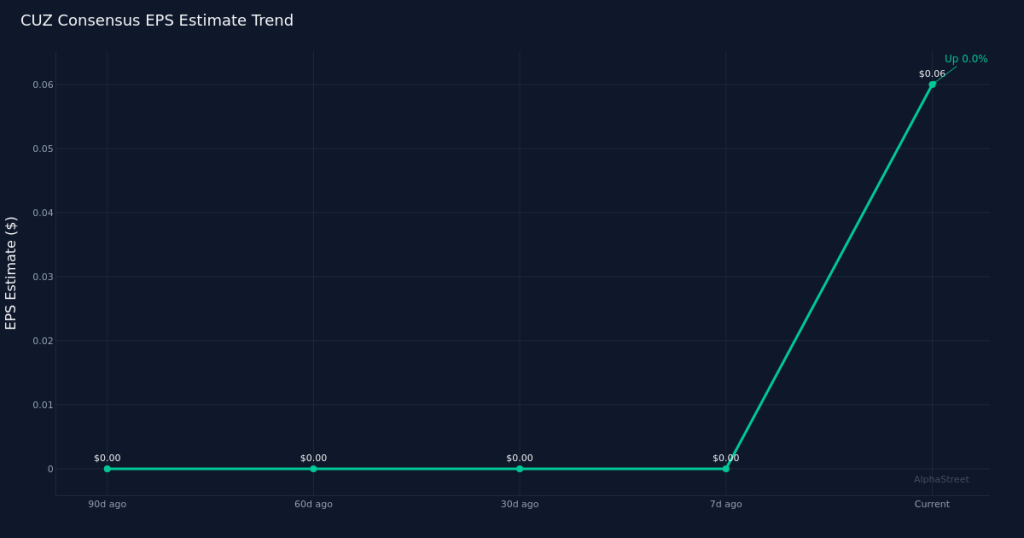 CUZ|EPS Est $0.06 (1 analysts)|Rev Est $258.3M|Reports 2026-04-30 None