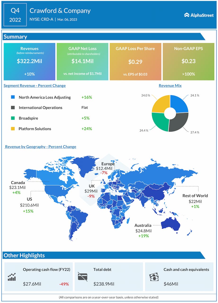 Crawford & Company (NYSE: CRD-A) reported revenues before reimbursements of $322.2 million for the fourth quarter of 2022, up 10% year-over-year.