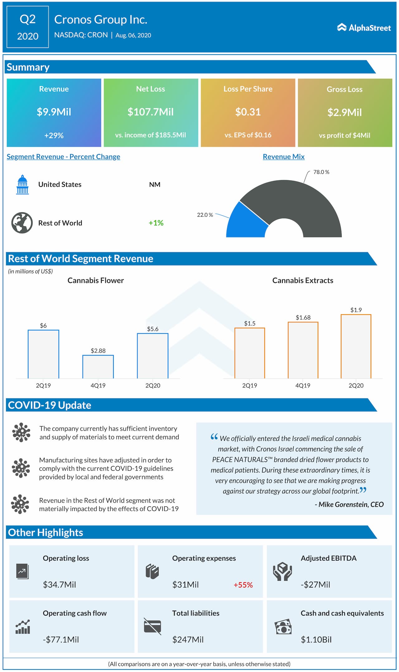 Cronos Group Inc. (NASDAQ: CRON) reported second quarter 2020 earnings results today.