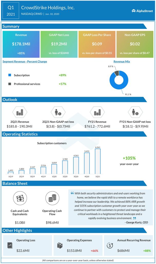 Looking ahead, CrowdStrike believes cybersecurity is an important aspect and companies are investing significantly in this space. The company expects to see tailwinds from digital transformation, cloud adoption, work-from-home trends and the capture of market share from competitors and believes it is well-positioned to take advantage of the opportunities ahead.