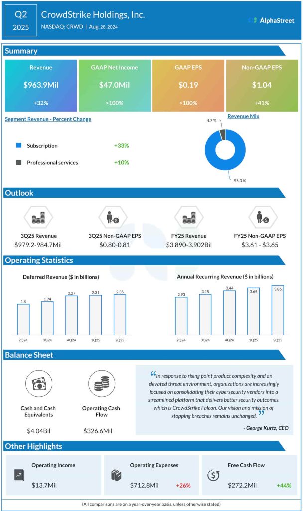 Adjusted earnings climbed 41% year-over-year to $1.04 per share during the three months. Net income attributable to CrowdStrike, on a reported basis, more than doubled to $47.0 million or $0.19 per share in the July quarter.