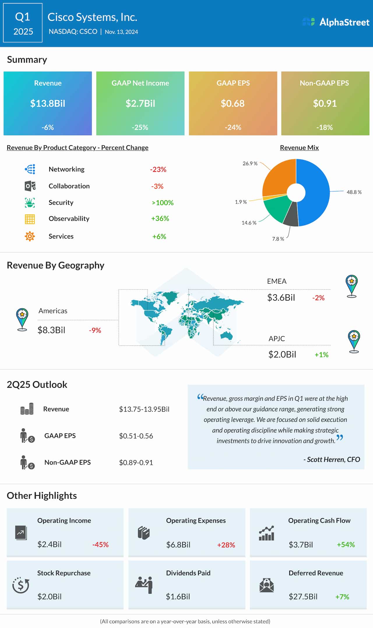 Network gear maker Cisco Systems Inc. (NASDAQ: CSCO) reported a year-over-year decrease in revenue and earnings for the first quarter of 2025. Earnings topped expectations.