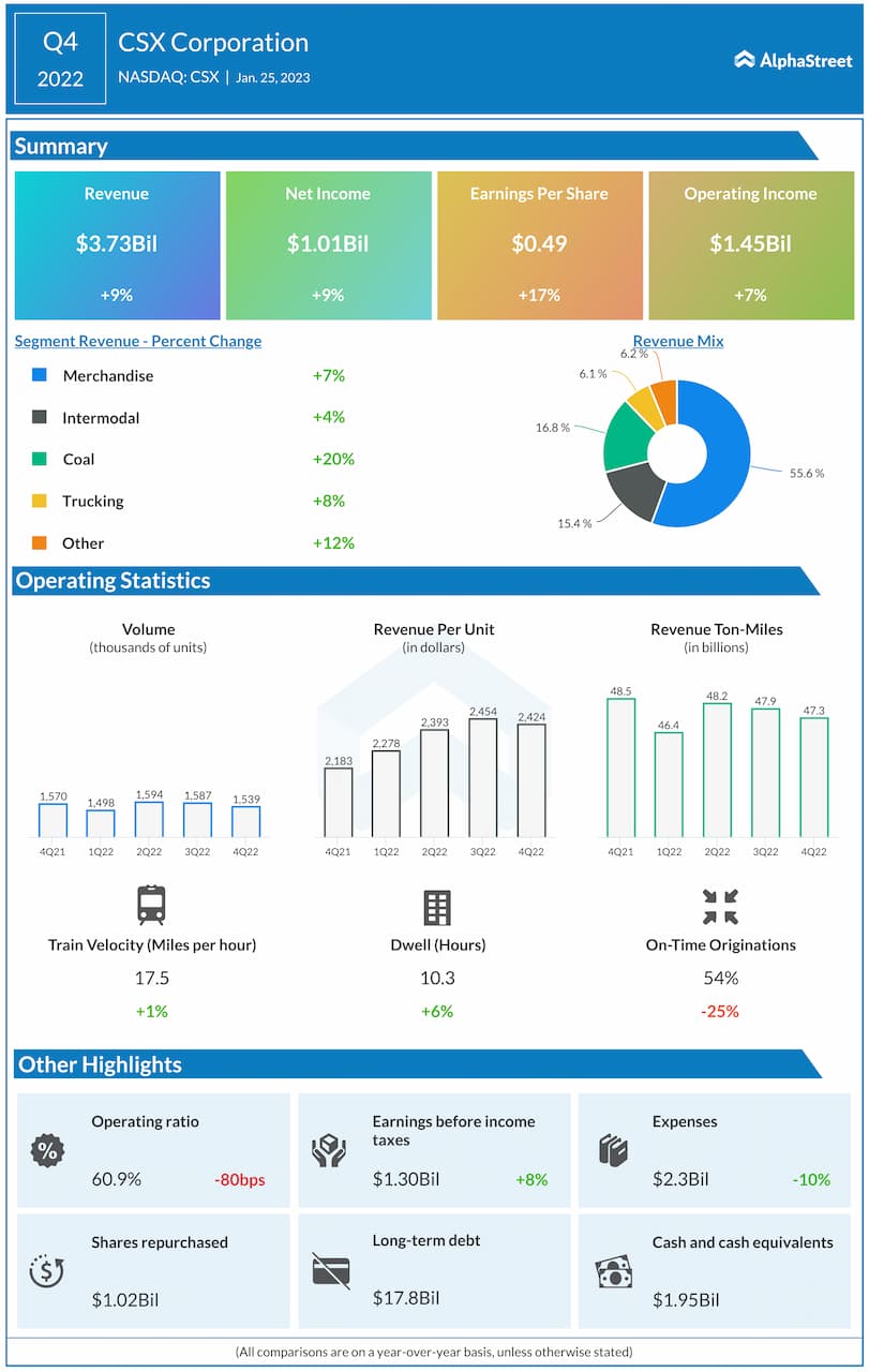 CSX Corp. (NASDAQ: CSX) reported revenue of $3.73 billion for the fourth quarter of 2022, up 9% year-over-year.