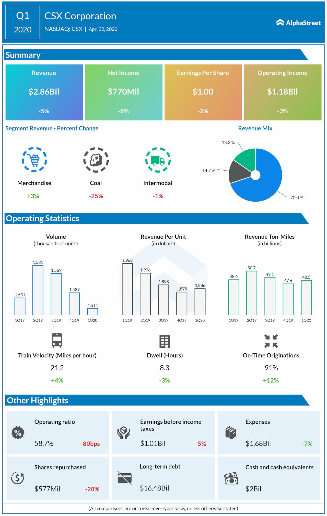 The operating performance continued to improve in the first quarter as train velocity increased 4% to a new first-quarter record level while car dwell fell 3% to a new all-time record level. Looking ahead, the company is withdrawing guidance given the current economic uncertainty related to the COVID-19 pandemic.