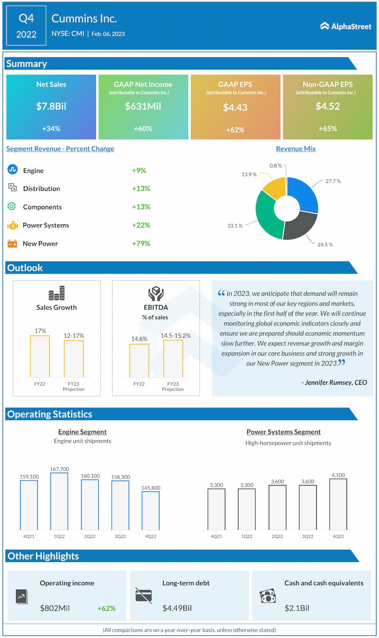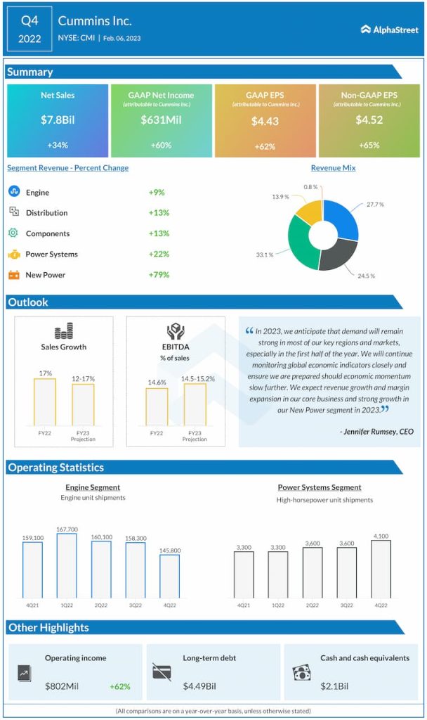 Cummins Inc. (NYSE: CMI) reported revenue of $7.8 billion for the fourth quarter of 2022, which was up 34% from the same period a year ago.