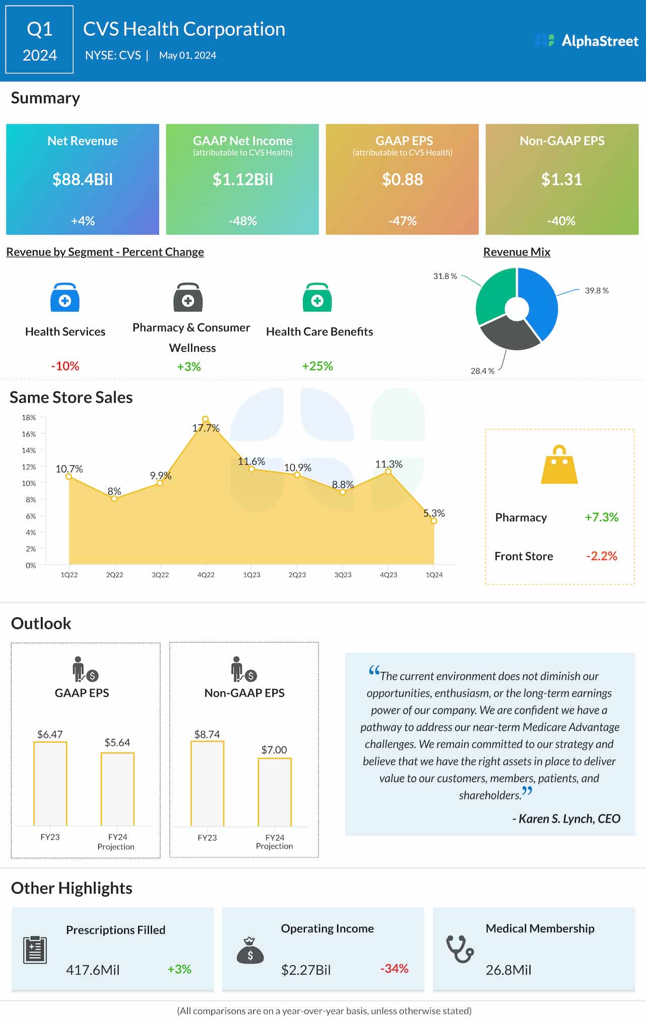 Healthcare conglomerate CVS Health Corporation (NYSE: CVS) announced first-quarter 2024 results, reporting higher revenues and a decrease in adjusted earnings.