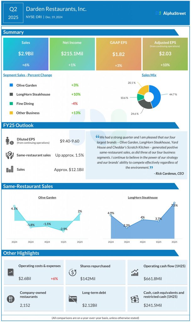 For fiscal year 2025, Darden expects total sales of approx. $12.1 billion and same-restaurant sales growth of approx. 1.5%. Adjusted EPS from continuing operations is expected to be $9.40-9.60.