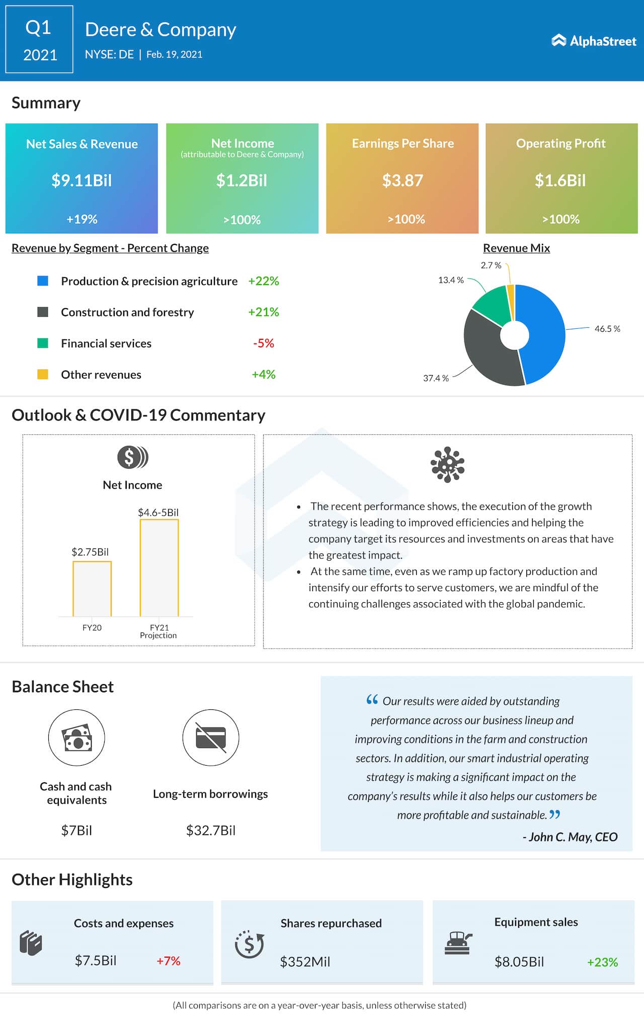 Deere and Company (NYSE: DE) reported first-quarter 2021 financial results before the regular trading hours on Friday.