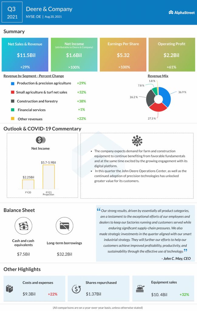 Deere and Company (NYSE: DE) reported third-quarter 2021 financial results before the regular trading hours on Friday.