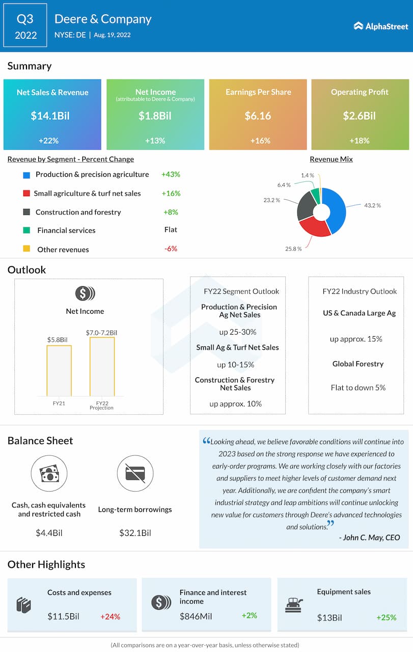 Deere & Company (NYSE: DE) reported third quarter 2022 earnings results today.