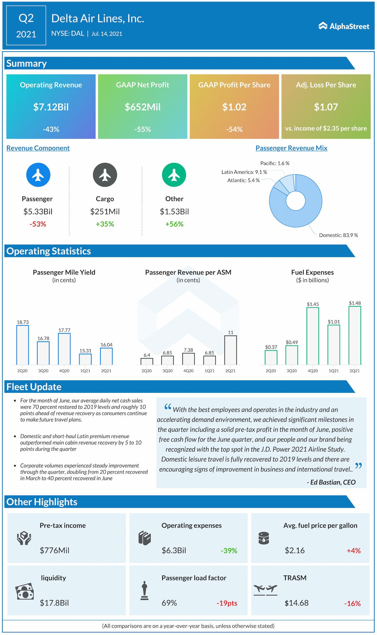 For the third quarter of 2021, Delta expects total revenue to be down 30-35% from the same period in 2019. Capacity is expected to be down 28-30% while CASM-ex is expected to be up 11-14%. Fuel price is estimated to range between $2.05-2.15 per gallon. Capital expenditures are expected to be around $800 million.
