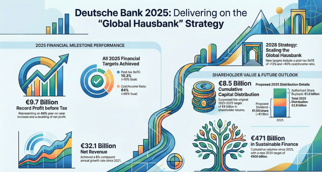 As of early 2026, Deutsche Bank has completed its transformation phase, meeting all 2025 financial goals. It has surpassed its original capital distribution commitment of €8 billion, reaching €8.5 billion. The bank is now focused on its next strategic phase, “Scaling the Global Hausbank,” aimed at accelerating value creation and European leadership.