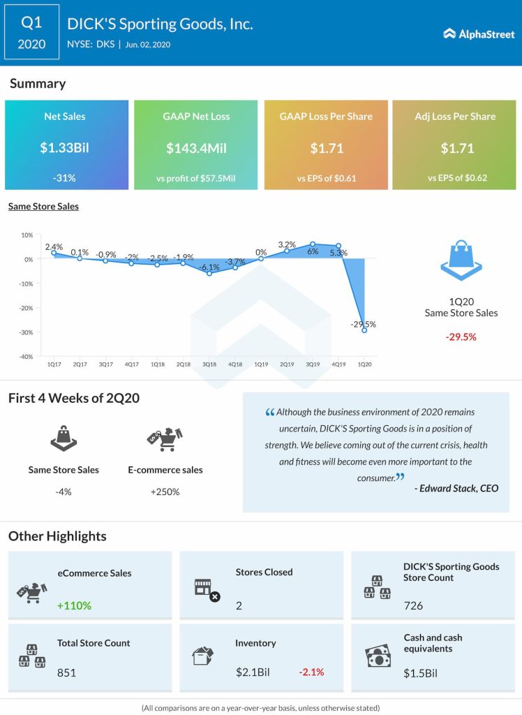 DICK’S Sporting Goods Inc. (NYSE: DKS) slipped to a loss in the first quarter of 2020 from a profit last year, due to the impacts from temporary store closures, expenses, teammate compensation, and safety costs, as well as inventory write-downs. The top-line fell by 30.6% year-over-year.