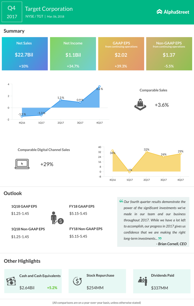 On Tuesday, Target reported its fourth quarter and fiscal year 2017 results. The retailer saw a 3.6% increase in total sales, driven by a strong holiday season, along with a 29% increase in its online sales.