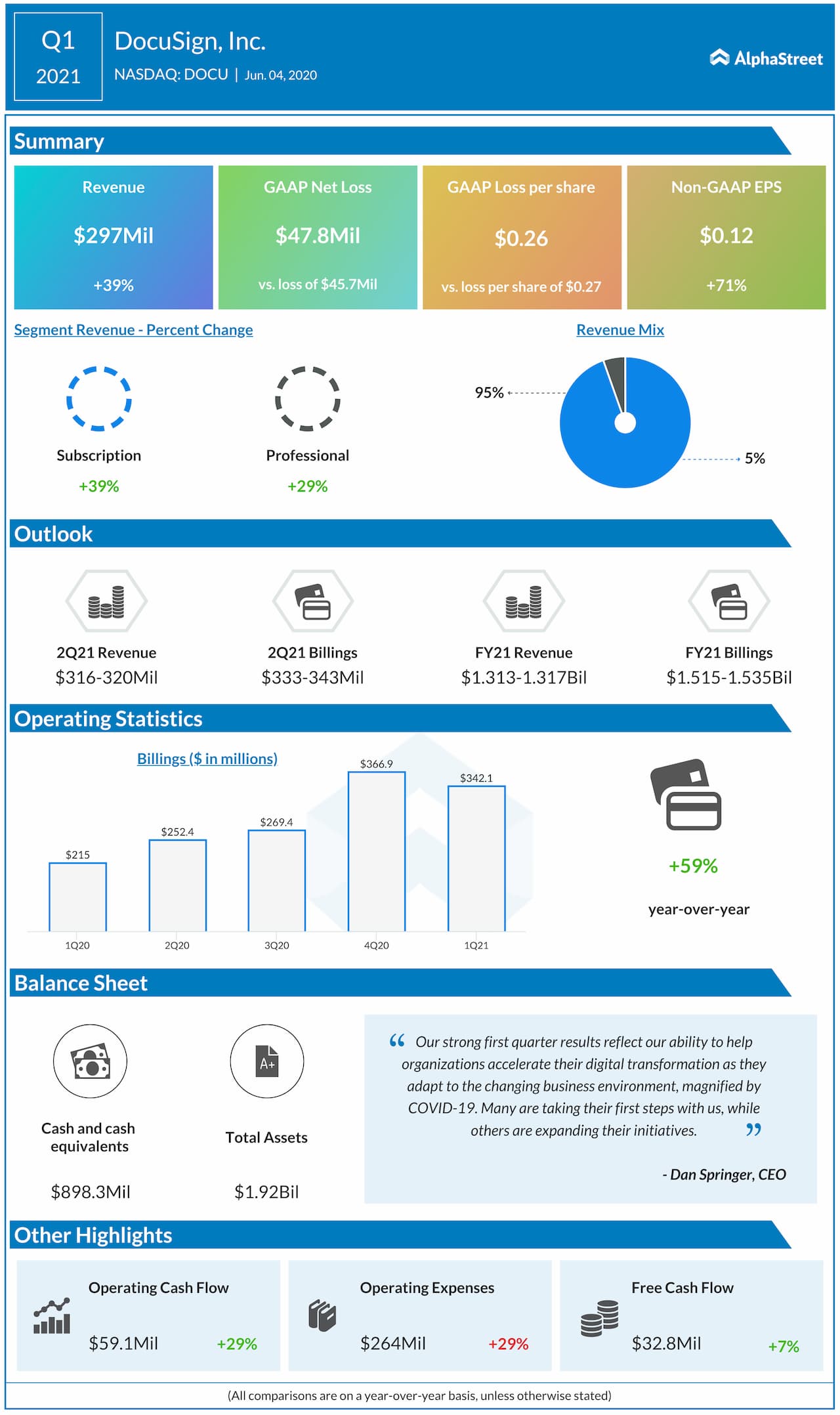 DocuSign witnessed a 39% increase in revenue along with a 59% growth in billings, driven by both the adoption by new customers as well as an expansion in use cases across a broad portion of its installed base.