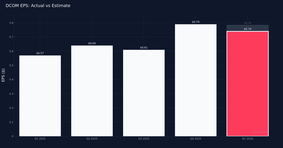 Earnings Miss. Dime Community Bancshares, Inc. (NASDAQ:DCOM) reported Q1 2026 adjusted EPS of $0.74, falling short of the $0.78 analyst estimate by 5.1%. The regional bank generated revenue of $123.6M for the quarter, reflecting a 19.0% increase from the $103.8M recorded in Q1 2025. Adjusted net income reached $32.4M as the company navigated a challenging operating environment for mid-sized regional lenders.