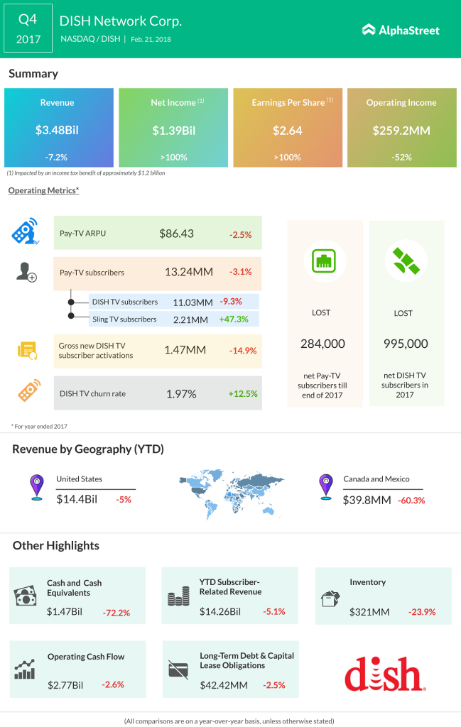 For the first time ever, the satellite operator even gave the numbers for Sling TV. As of Dec. 31, 2017, the number of Sling TV subscribers rose by almost 47% to 2.21 million compared to 1.5 million a year earlier. At the end of 2017, the company had 13.2 million Pay-TV subscribers, down 429,000 from the year-earlier period. In addition to the Sling TV subscribers, Dish reported having 11.02 million subscribers for DISH TV. The Pay-TV ARPU slipped to $86.43 in 2017 from $88.66 in the previous year because of more Sling TV subscribers paid lower monthly fees ($20).