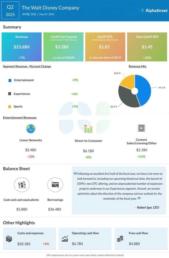 For fiscal year 2025, Disney expects adjusted EPS to increase 16% YoY to $5.75. The company had earlier guided for high-single-digit adjusted EPS growth for the year.