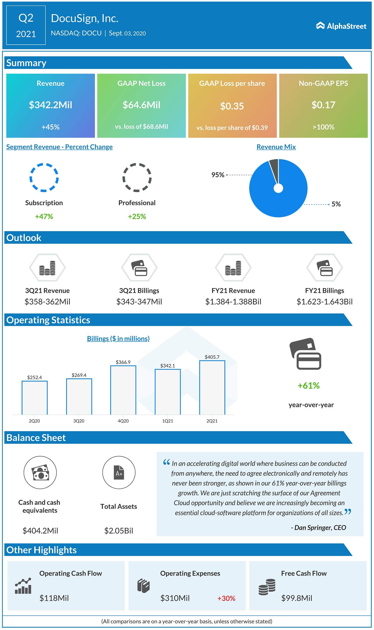 For the third quarter of 2021, DocuSign expects revenue to be between $358 million and $362 million. For the fiscal year 2021 ending January 31, 2021, the company expects revenue to be between $1.384 billion and $1.388 billion.